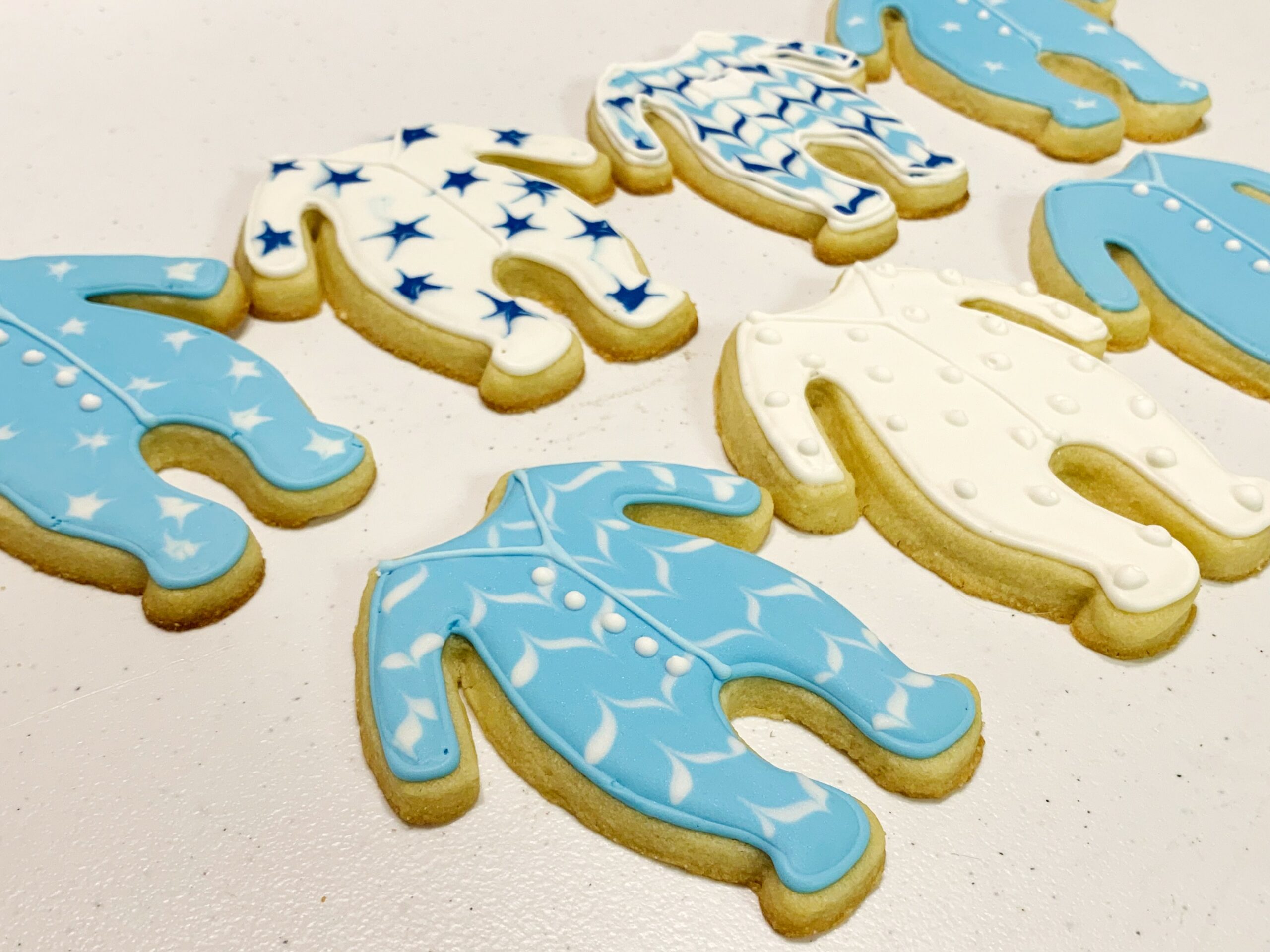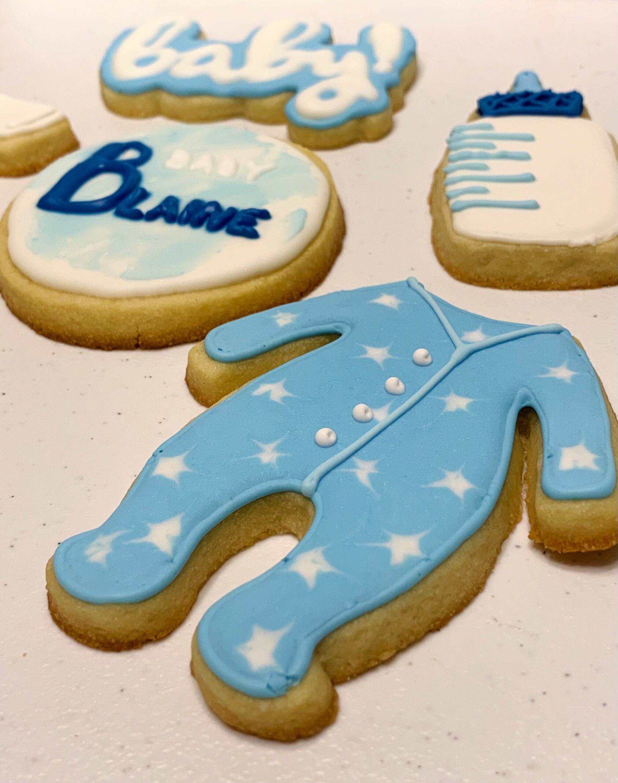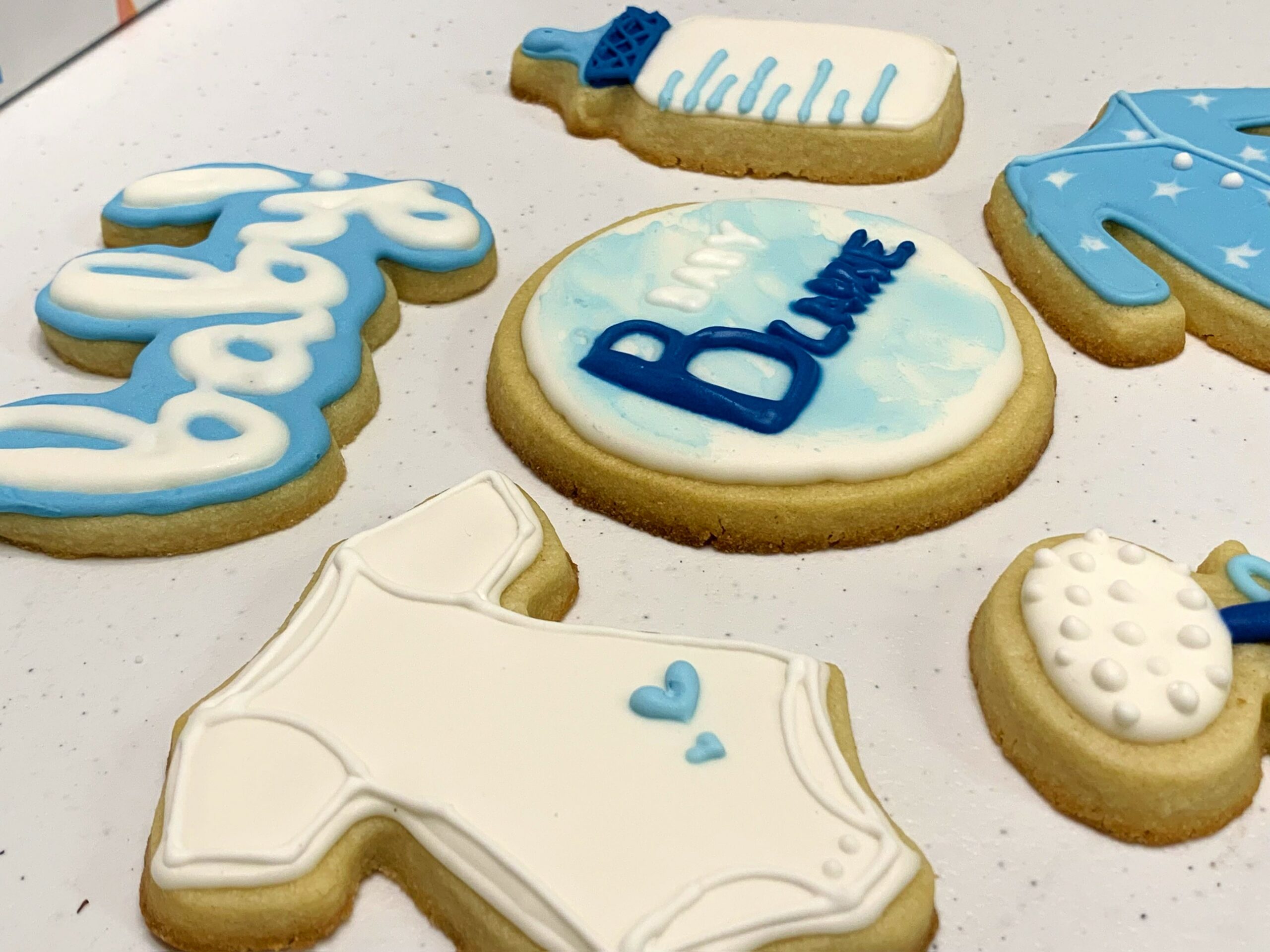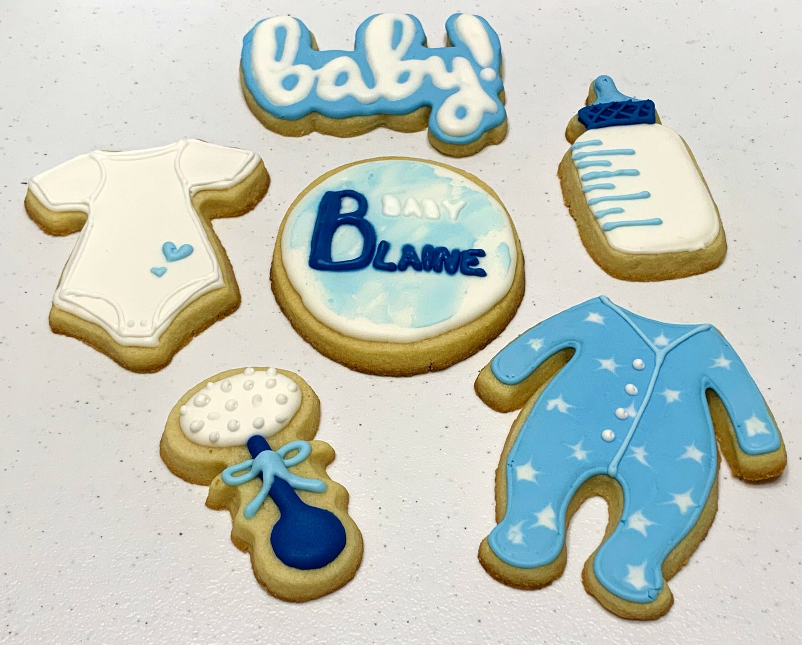 Celebrate the arrival of a new little bundle of joy with these adorable baby boy shower treats! These adorable little treats were one of my first ever cookie orders! They are cute little frosted cookies shaped like onesies, bottles, rattles, and personalized treats!