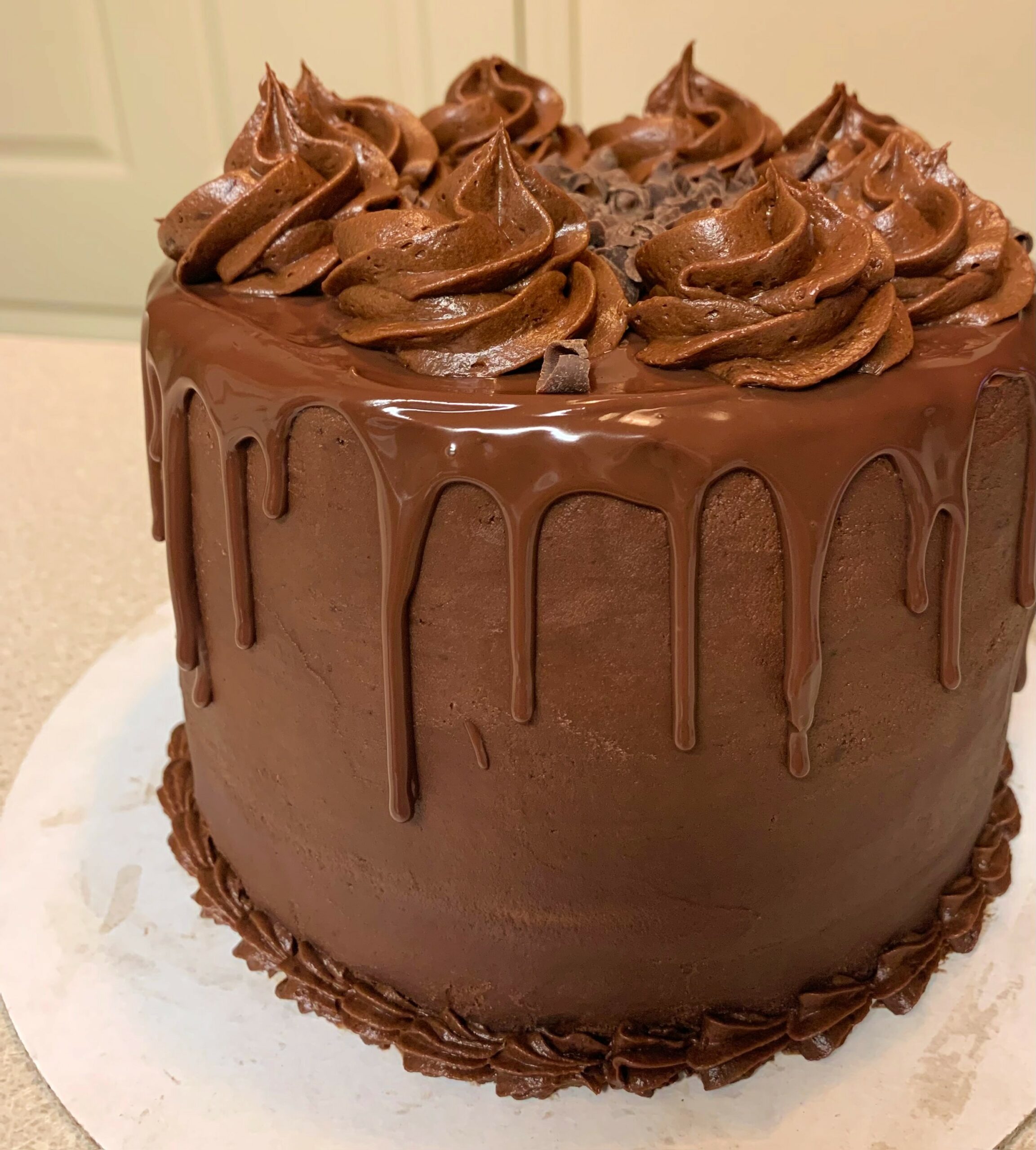Chocolate cake is a rich and indulgent dessert that is loved by people of all ages. This cake is sure to fulfill even the strongest chocolate craving. This customer wanted ALL chocolate. Chocolate cake, chocolate mousse filling, chocolate frosting, chocolate ganache drip, and chocolate curls on top — sign me up!