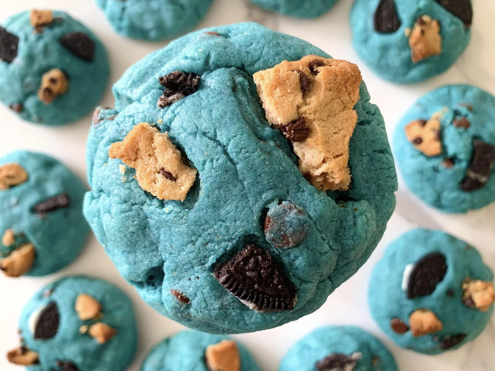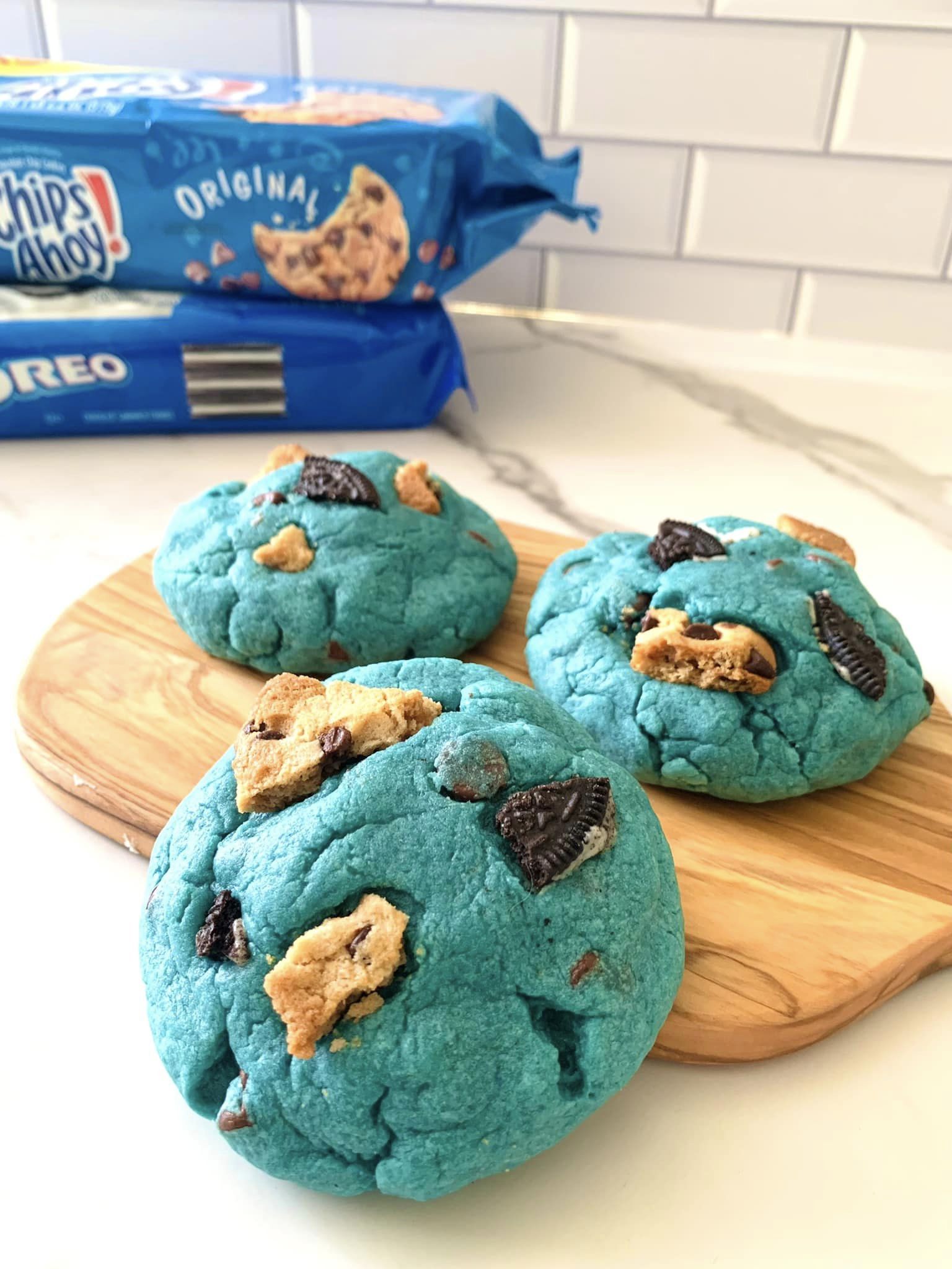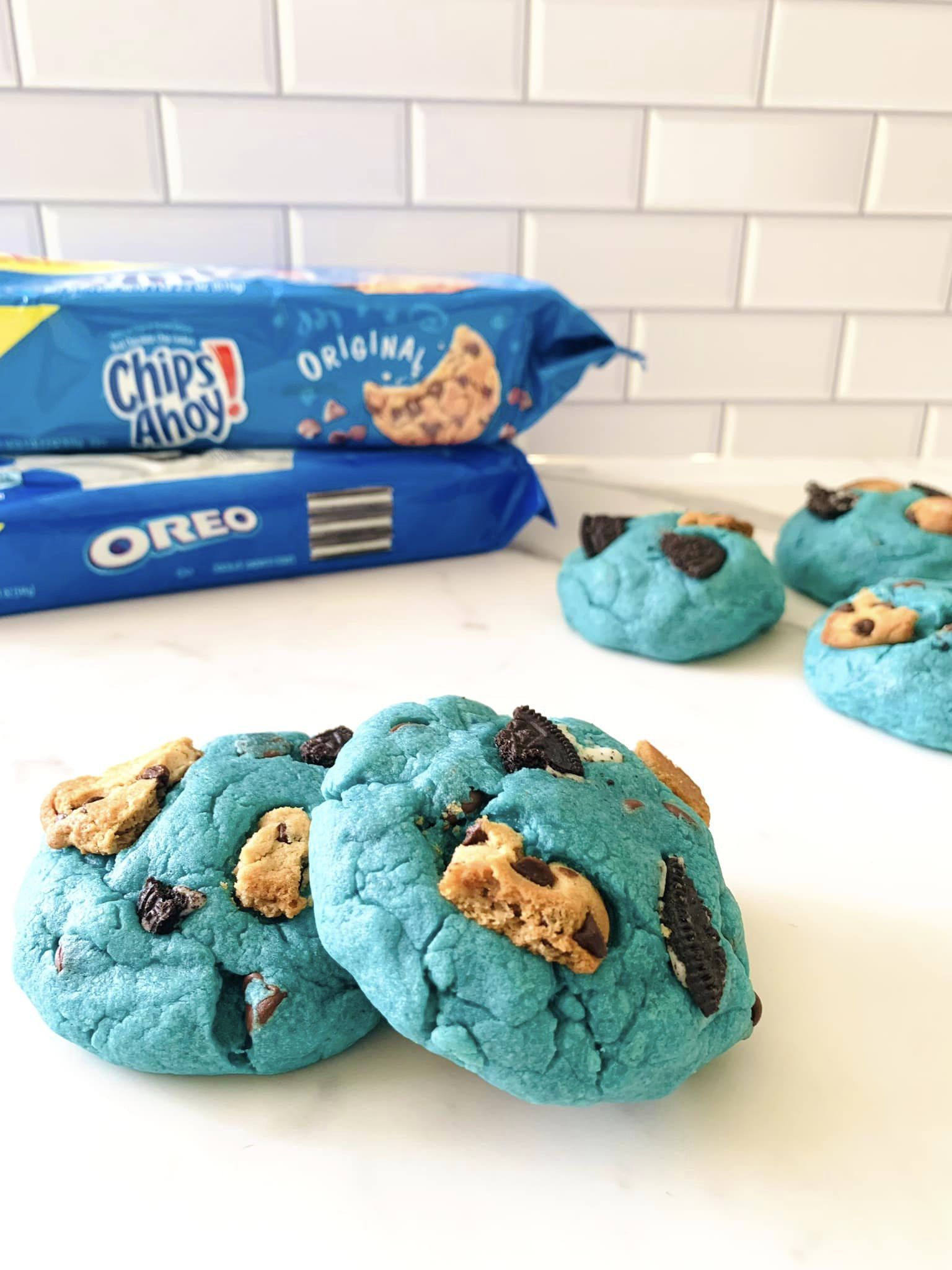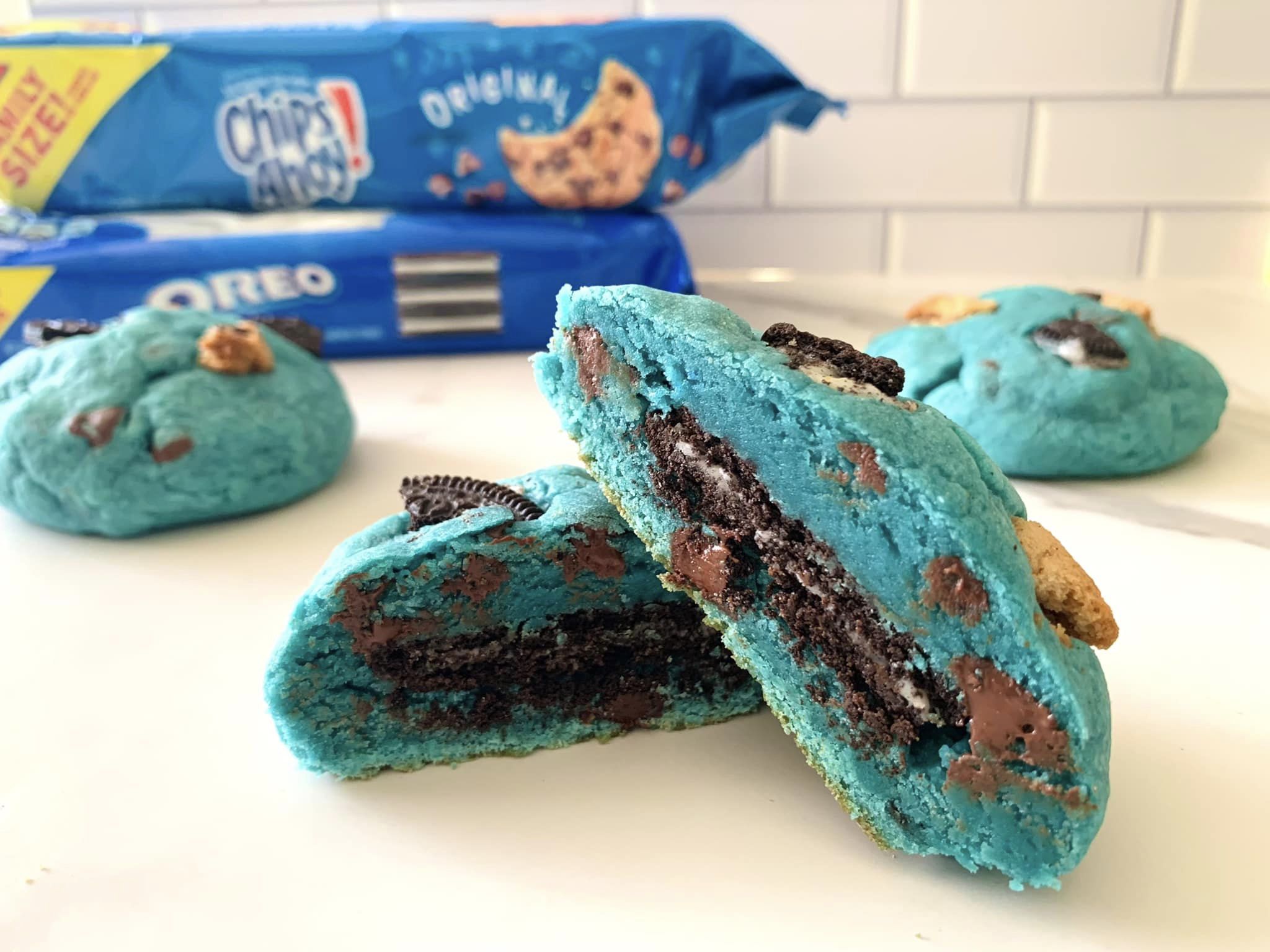 This monster of a cookie was inspired by the adored Cookie Monster. As many of you know, I recently had a baby and she loves Sesame Street So, how could I not make a cookie inspired by the most famous cookie connoisseur? This cookie is a blue chocolate chip cookie, stuffed with an Oreo, and topped with Oreos and Chips Ahoy. What could be better than that?! If you like cookies as much as Cookie Monster, then this is the cookie for you!