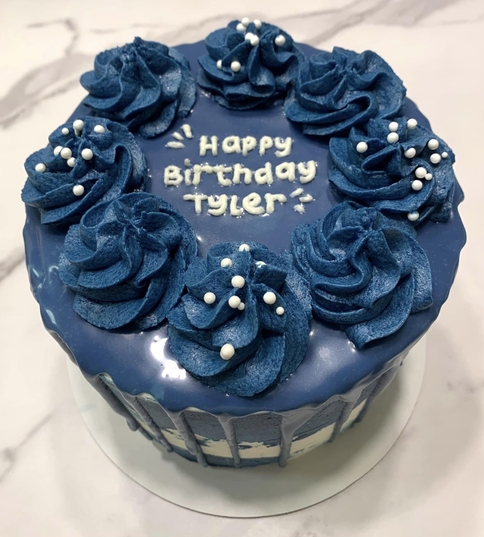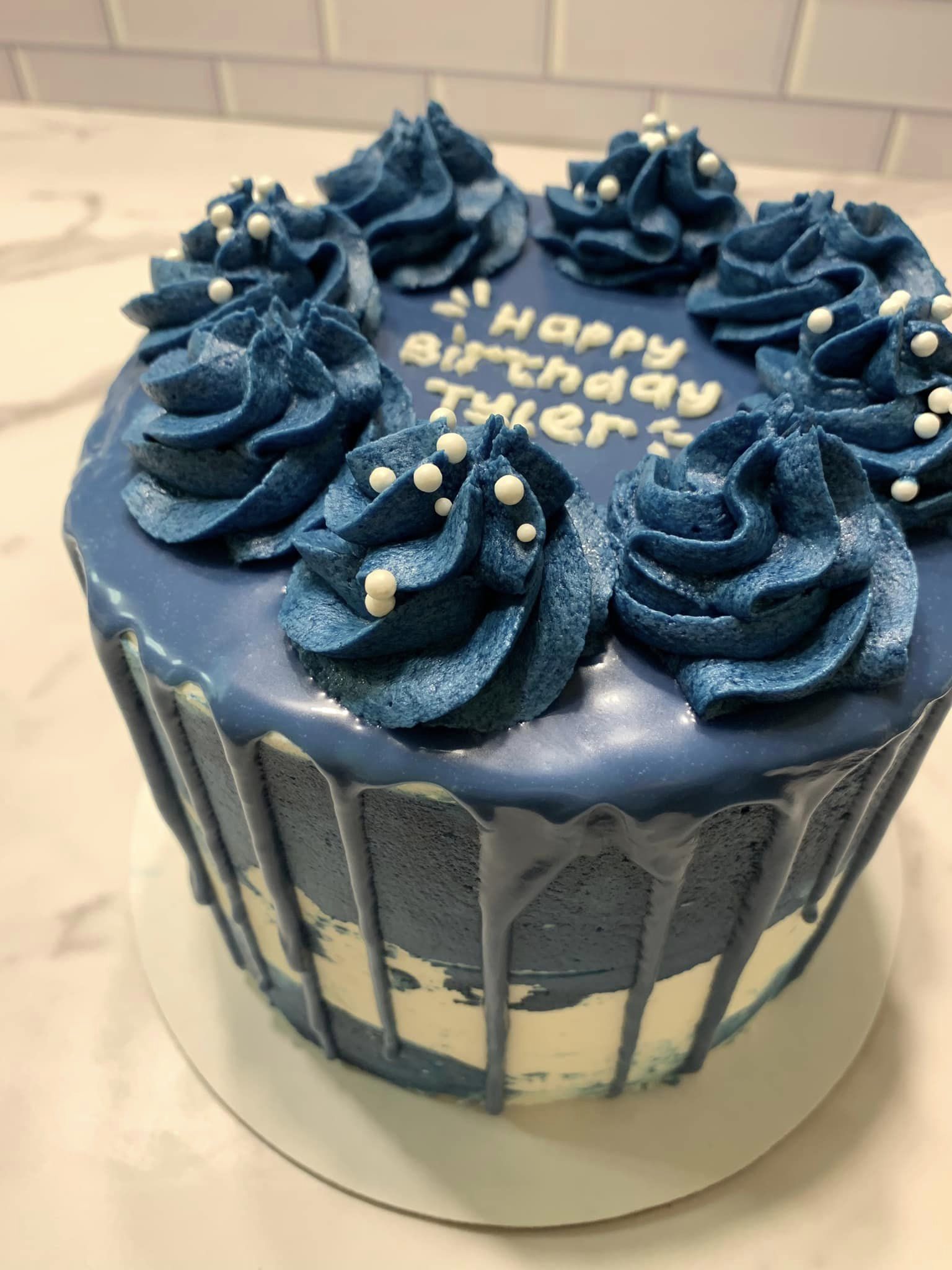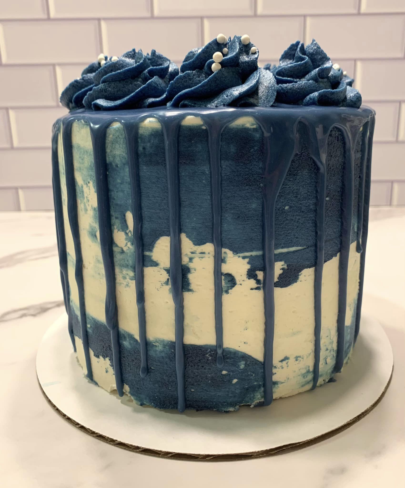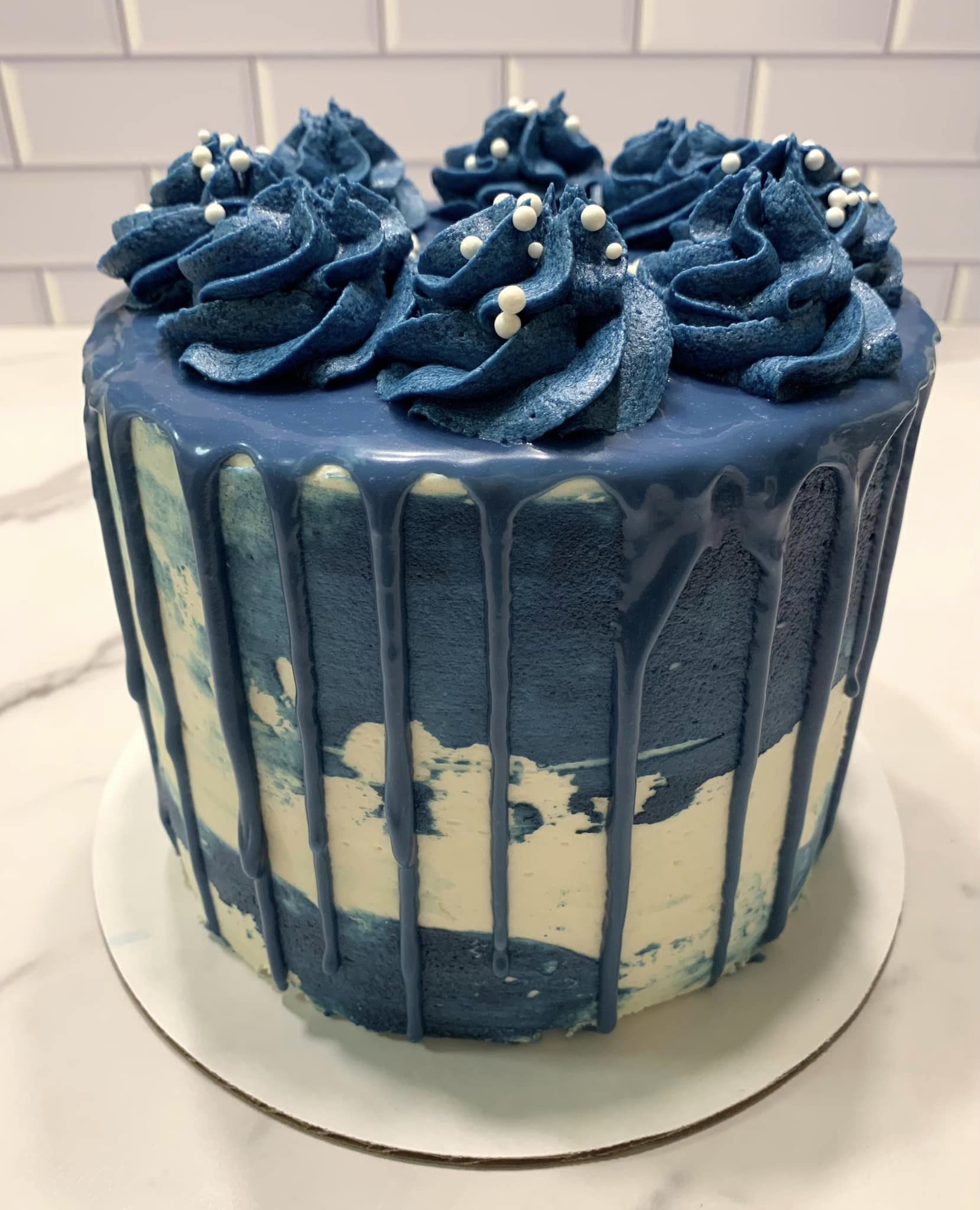 So excited to get feedback from the customer on this one! She said that her husband wanted a navy blue strawberry cake. I’ve been really wanting to try a new strawberry cake recipe and she was nice enough to let me try it out on them! I hope they like it — it sounded really yummy! Aesthetically, the drips ran a little longer than I’d like but I love the color.