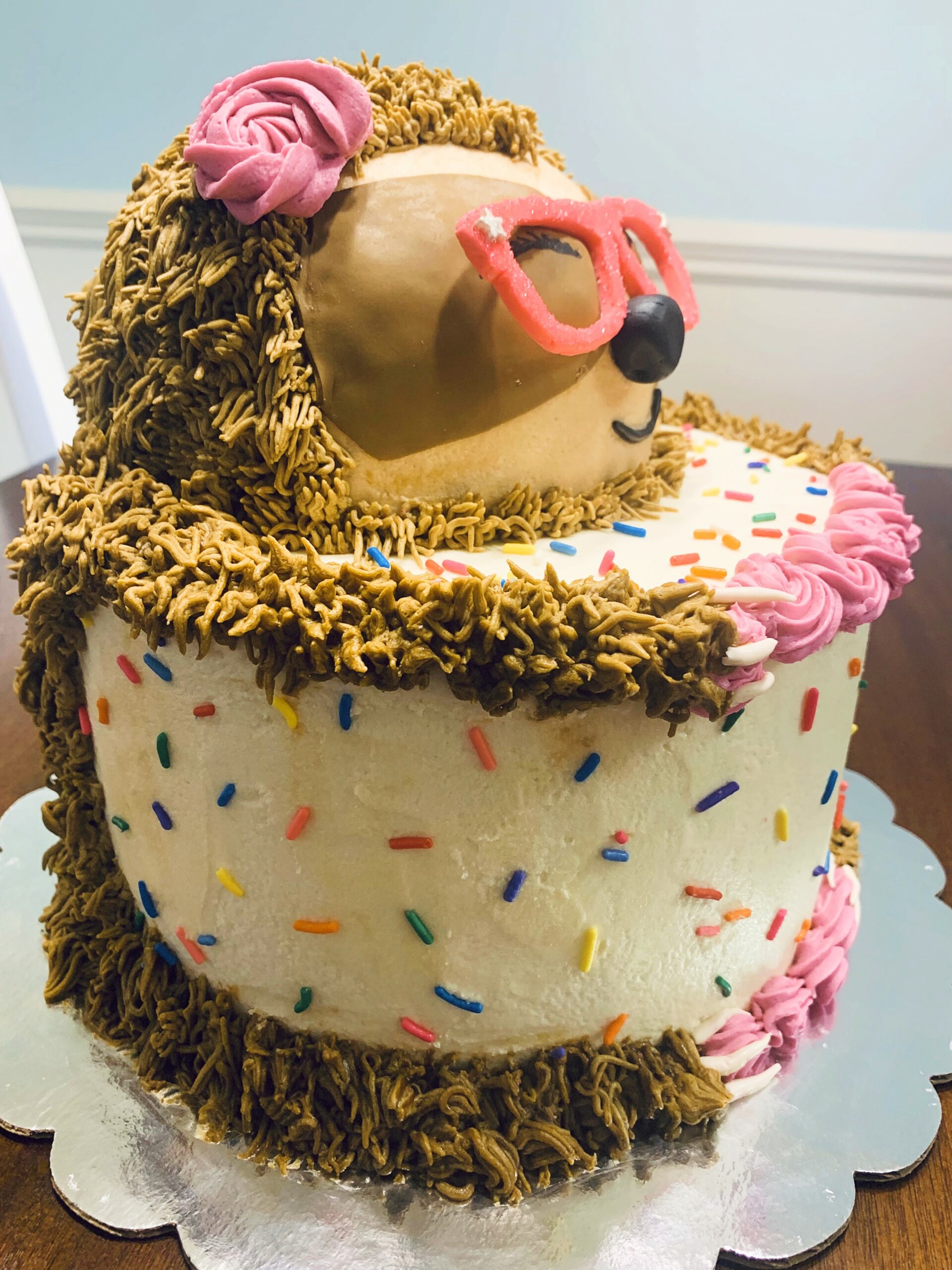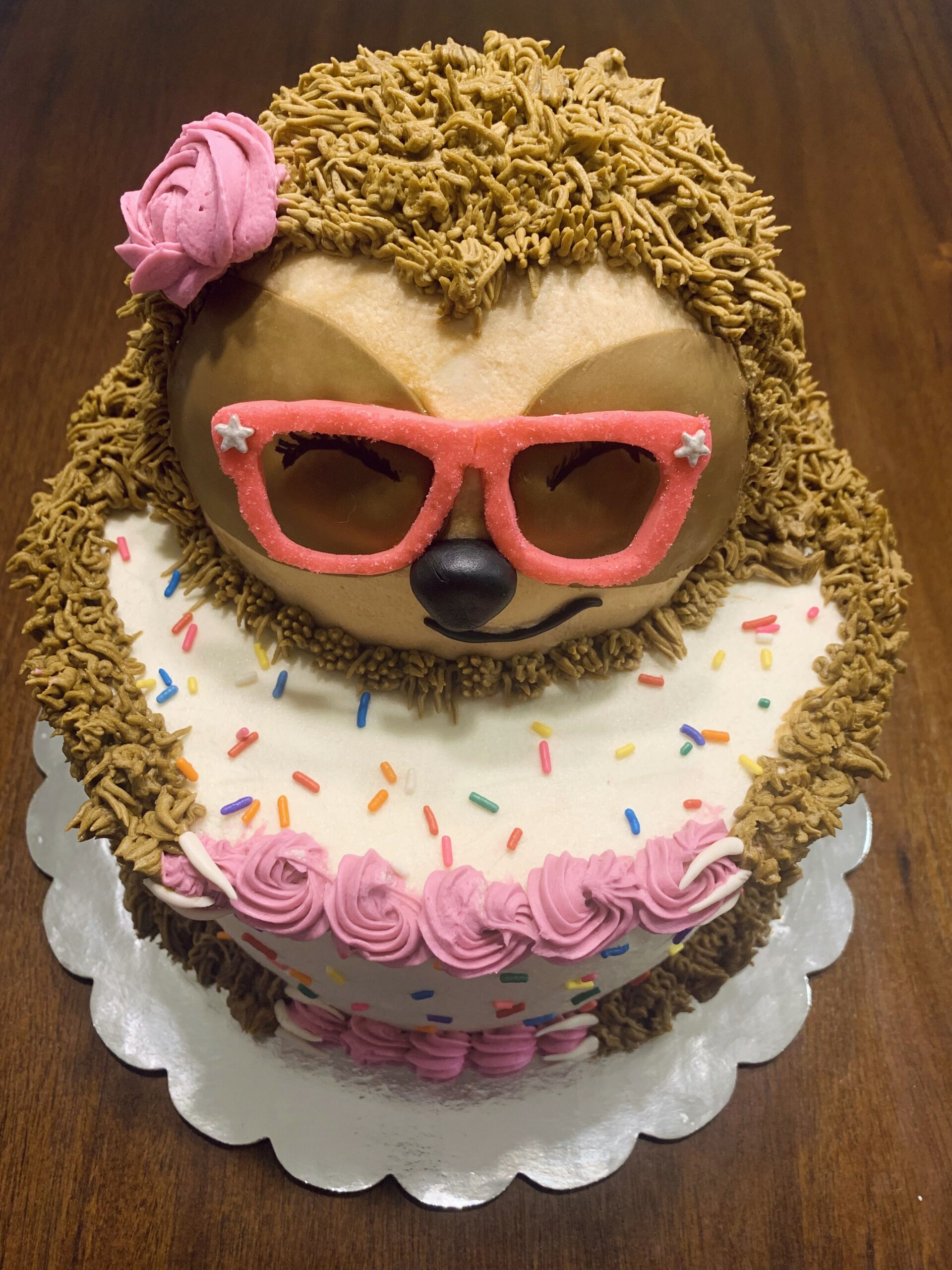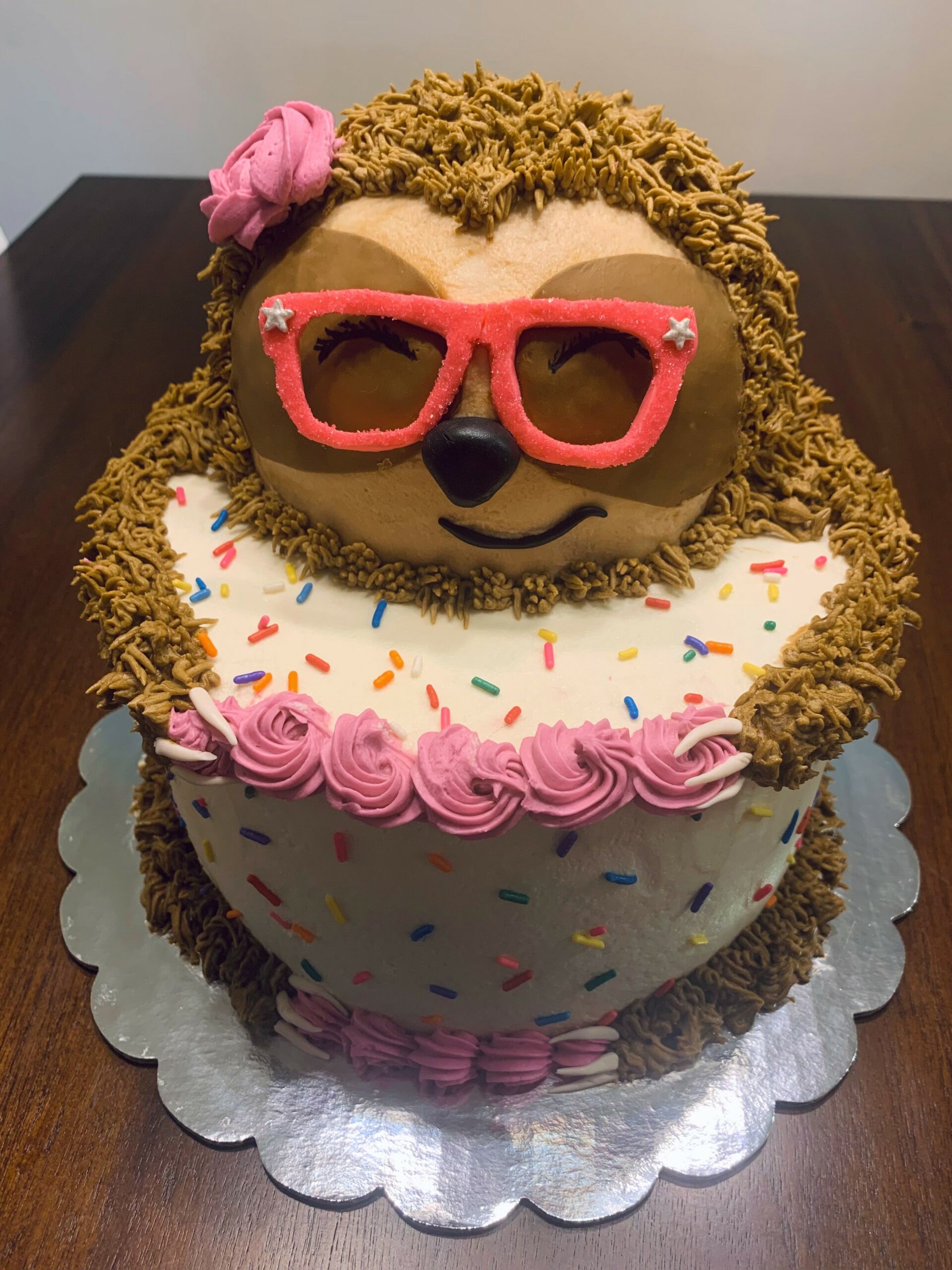 Do you love sloths? How could you not find these slow creatures adorable? Sloths have become increasingly more and more popular. So, when I was given the opportunity to create a sloth cake I jumped at the chance. This delicious sloth is a chocolate cake with buttercream frosting. Her stylish accessories are made with fondant and buttercream.